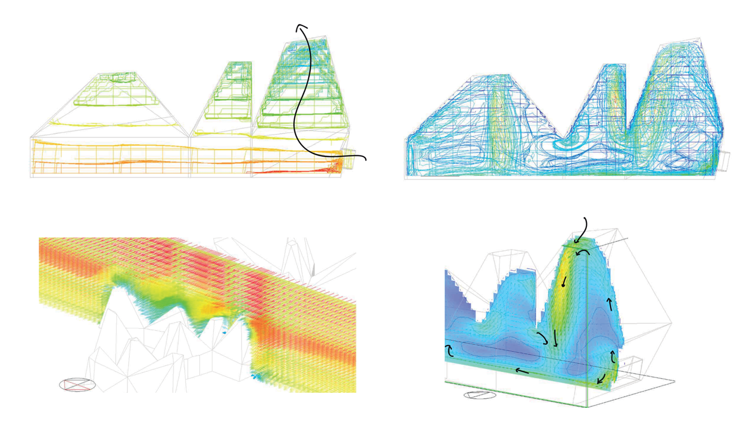 En el exterior, los análisis urbanos nos permiten entender la velocidad del viento y si serán lugares confortables para caminar y de estancia, o si por el contrario, requerimos de protecciones que nos cobijen o resguarden de fuertes vientos.