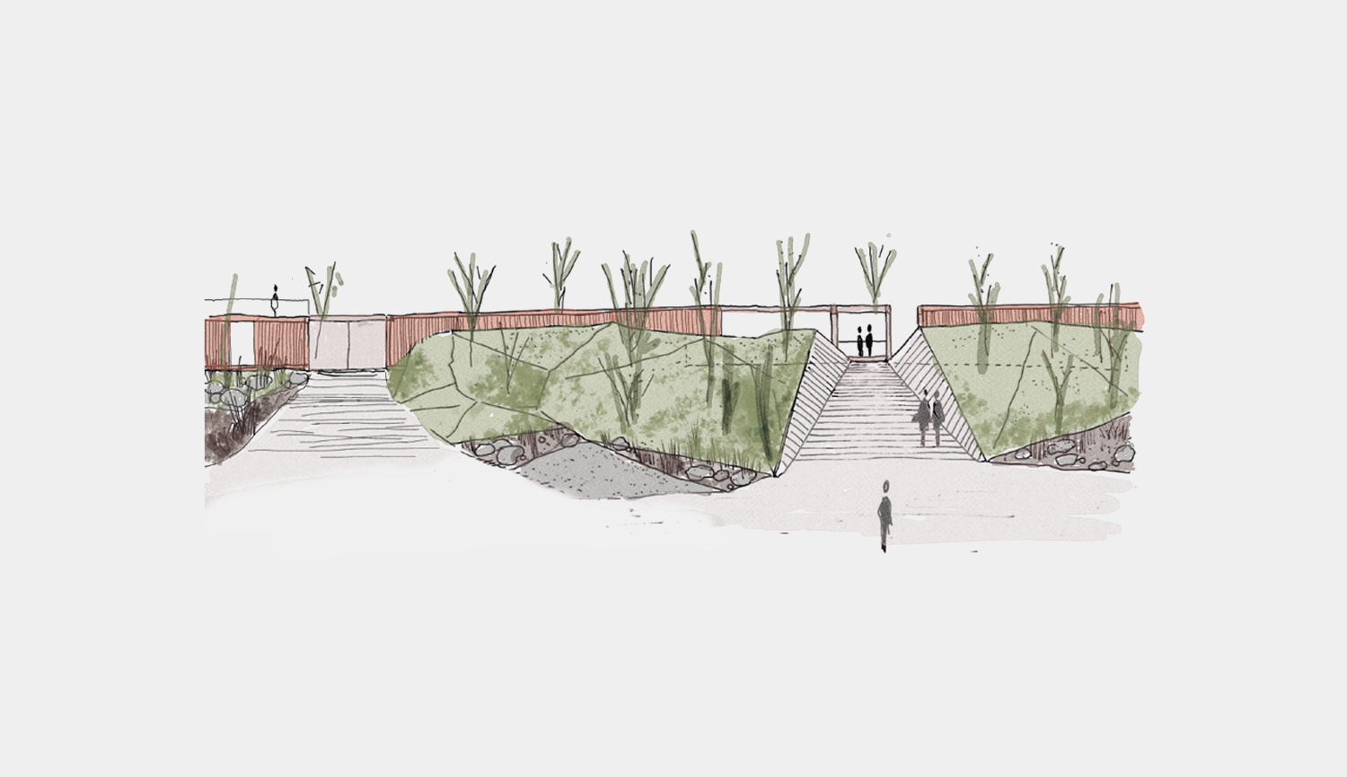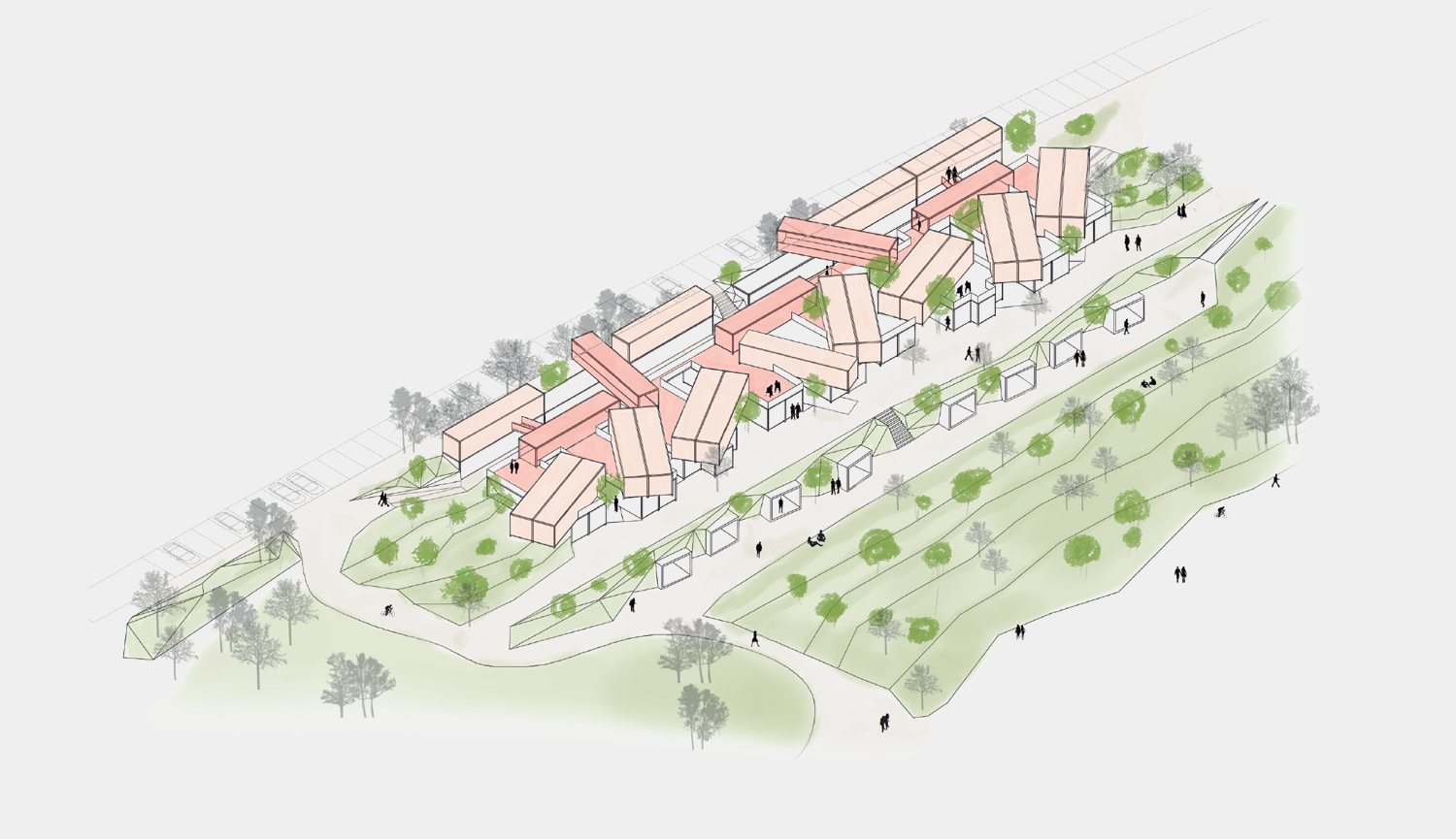 Pensado como un lugar en continua transformación, que no dañe el parque no se ubica, que permita realizar una vida al exterior, como un laberinto donde nos podemos perder y reencontrar, donde los niños y las familias encuentran un lugar al que pertenecen, un árbol, un helado, un pájaro, un cocinero que trabaja con los productos del huerto y la permacultura, un amigo haciendo yoga al aire libre, a mi mamá comprando un jugo saludable. Un espacio para todos donde poder perderme, aparecer y desaparecer, jugar y aprender, ver las montañas y descubrir el parque y la naturaleza que me rodea.