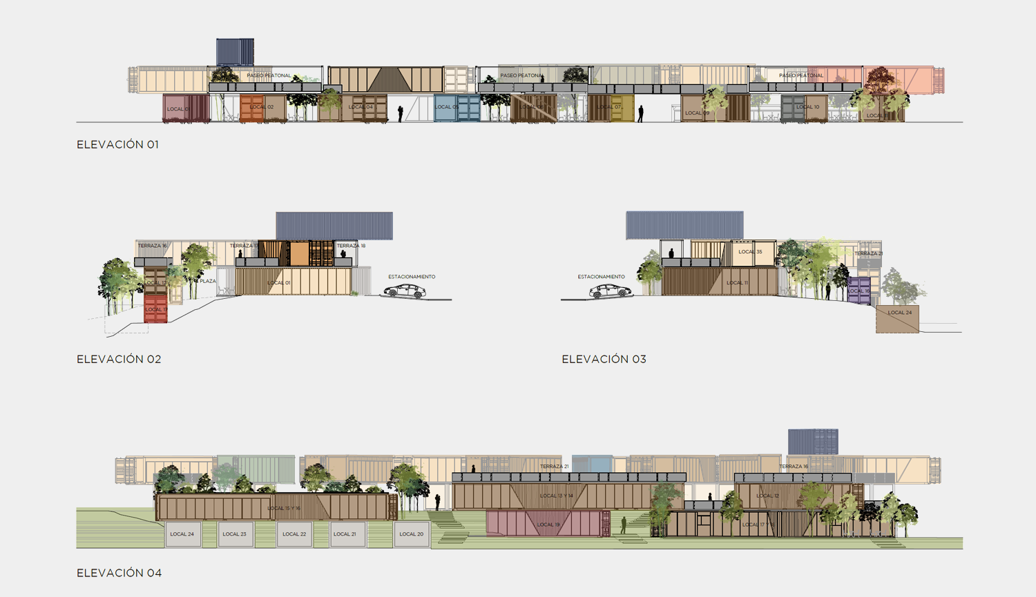 Este proyecto se trata de una plaza comercial itinerante en Zibatá. Se concibe el proyecto como un lugar dotado de pequeños negocios de productos sostenibles gastronómicos, de moda, de productos y servicios básicos que necesitamos día a día y con espacios de cowork que pretenden convivir con actividades deportivas, mascotas y crear una interacción natural y urbana con el parque donde se ubica, así como generar un valor agregado la sociedad.