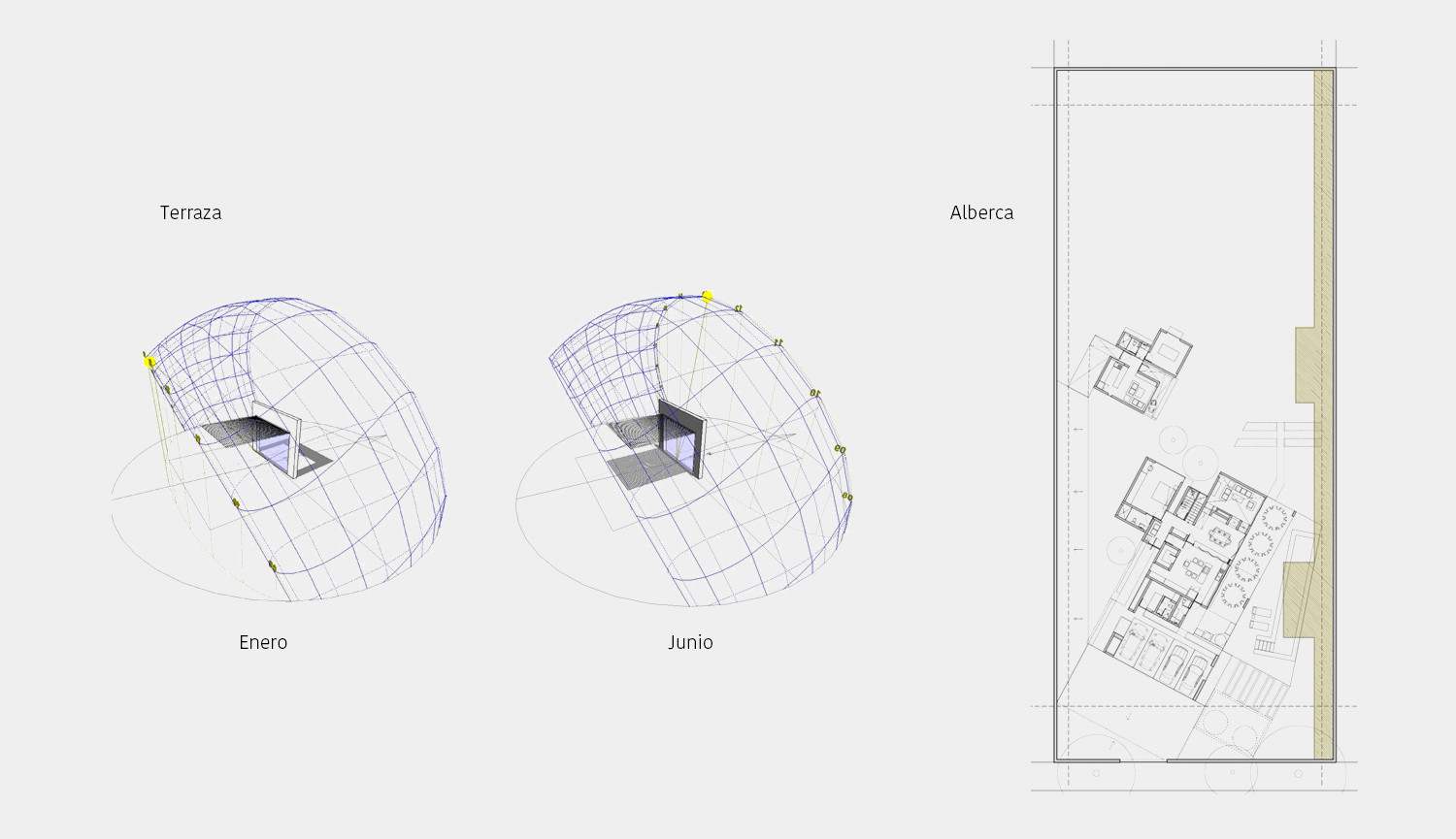 Se realiza estudio de asoleamiento para entender la influencia del volado de la terraza en verano e invierno. Se estudia también la ubicación de la alberca y las sombras arrojadas de las edificaciones existentes, resultados que nos permiten concluir en la reubicación de la misma para evitar sombras.